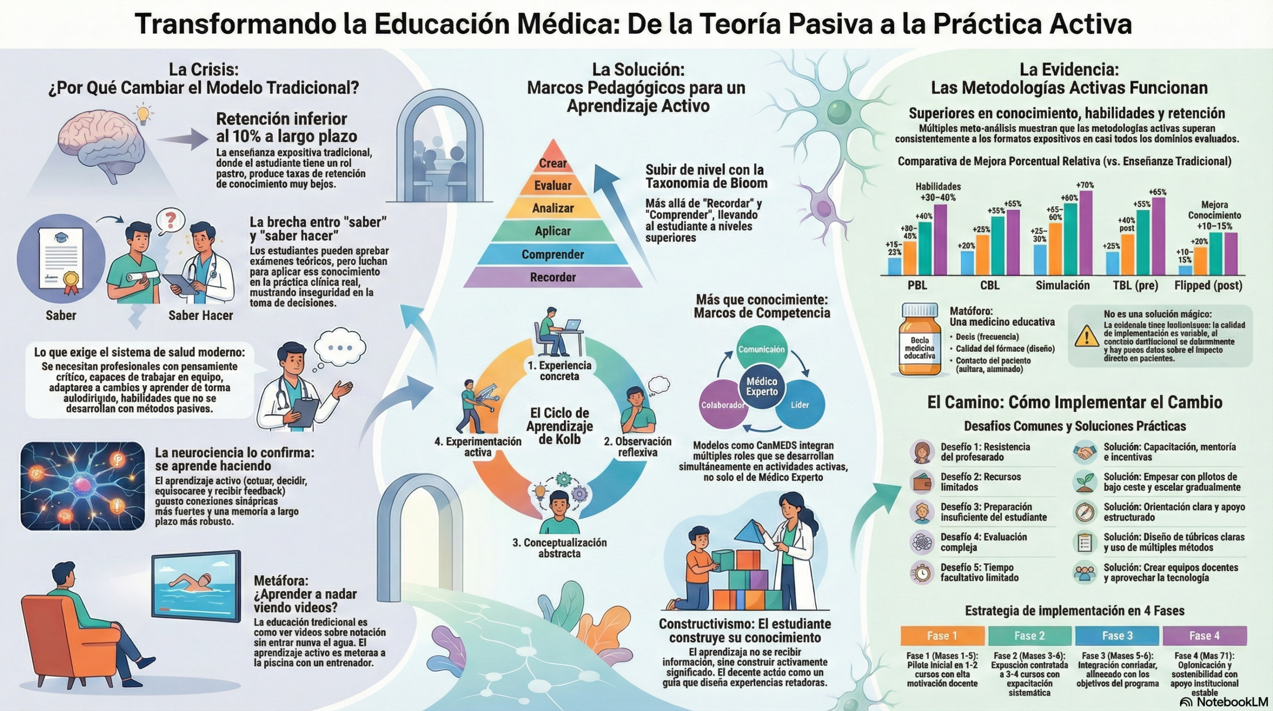 - Módulo 1: Fundamentos de Aprendizaje Activo en Educación MédicaDurante décadas, la educación médica se ha basado en una enseñanza principalmente expositiva, centrada en clases magistrales y en la transmisión unidireccional de información. Diversos estudios han mostrado que este enfoque produce tasas de retención a largo plazo inferiores al 10%, especialmente cuando el estudiante se mantiene en un rol pasivo y no aplica lo aprendido en contextos significativos.8